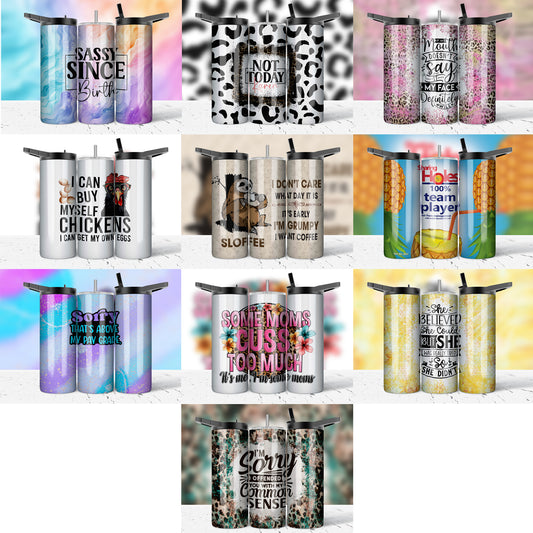 ASSORTIMENT D'IMPRESSIONS PAR SUBLIMATION PRÊTES À ÊTRE IMPRIMÉES POUR GOBELETS DROITS ET MINCES DE 20 oz (LOT DE 10) - SARCASME 2